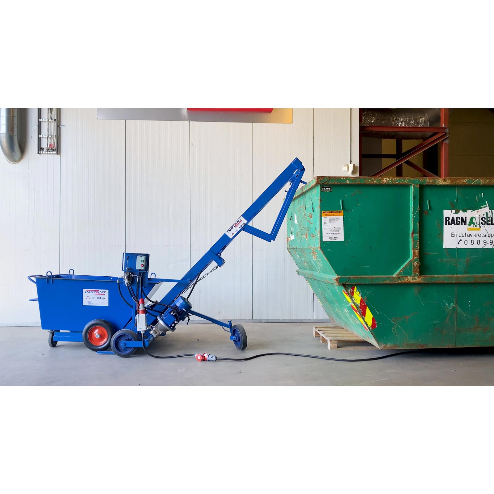 Heisen festes til kanten av en container. Når beholderen er koblet til, heises den opp og tømmes automatisk i midten av containeren. Denne metoden reduserer behovet mannskap og frigjør ressurser.